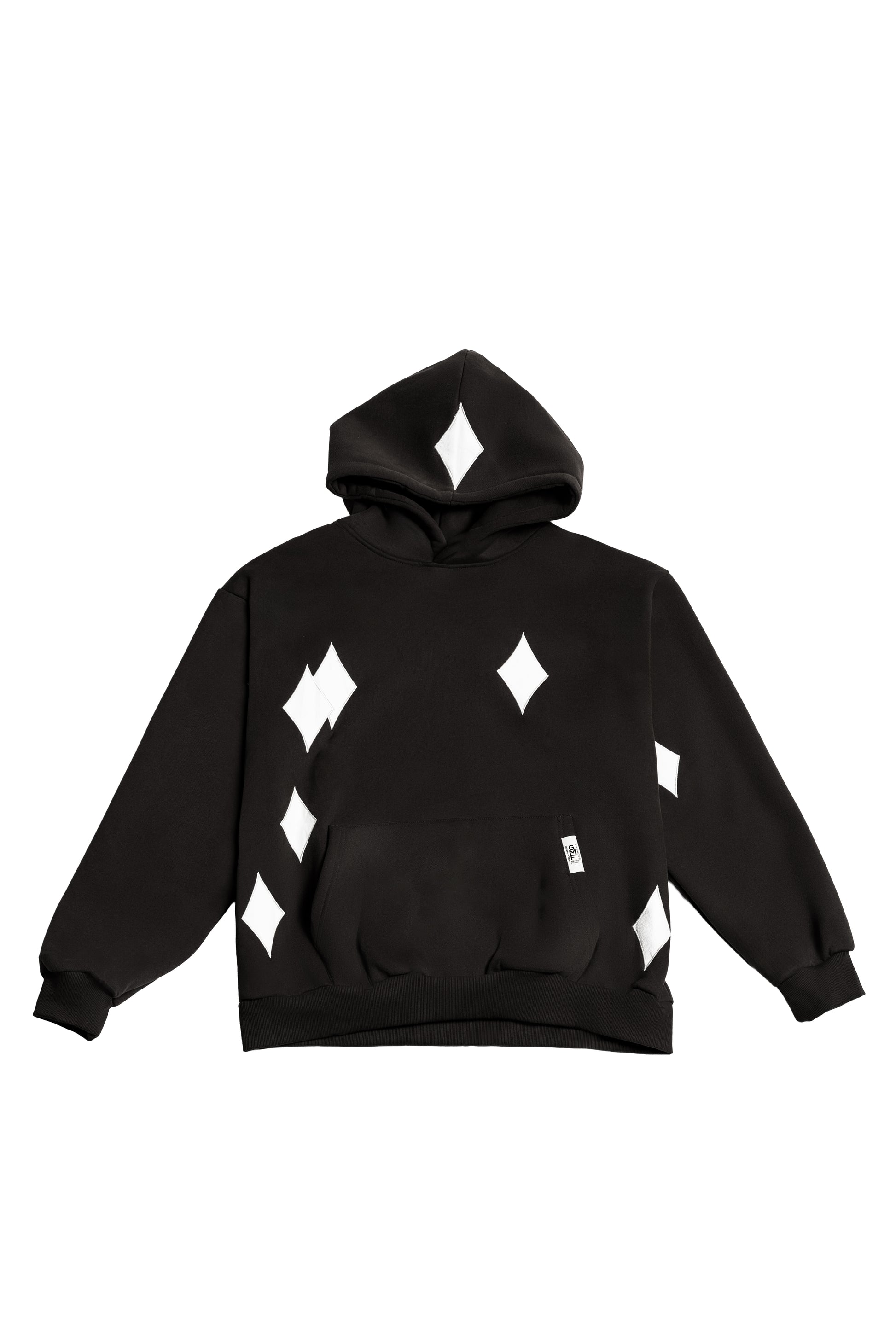 A heavyweight black hoodie — Deep black fabric, sharp white diamonds — a quiet force in the noise. Minimalist yet commanding. Dark, focused, unshakable.